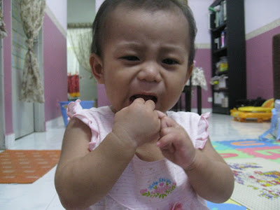 Sedikit perkembangan. Beliau sudah boleh berjalan sekarang. Maka sudah semakin panjang langkahnya mengekor saya ^_____^ Selain sudah ada kaki, mulut beliau juga sudah semakin riuh! Gigi ada 8 kesemuanya, 4 atas 4 bawah. Belum pandai erti gosok gigi. Setiap kali sua berus gigi, dia akan gigit. ingat kita nak bagi makan. Haiyaa